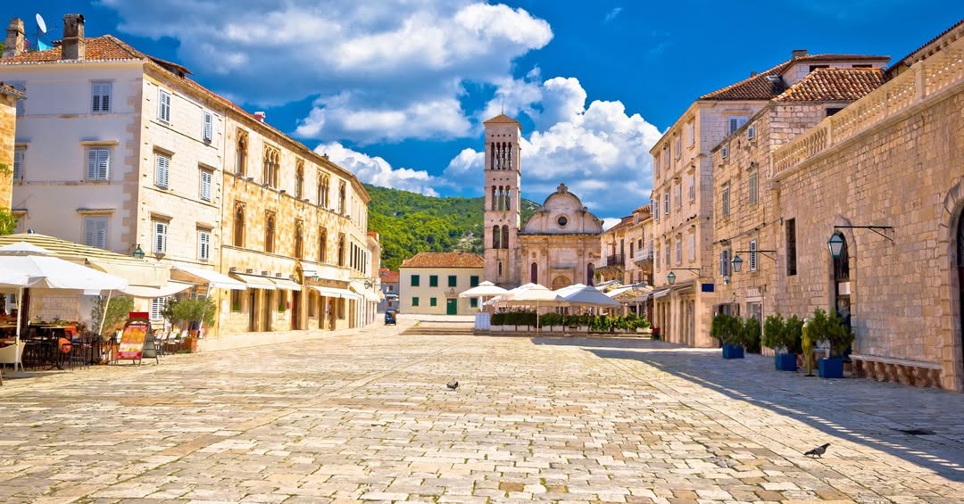 The main town sits on the southwest coast, facing the Pakleni Islands across a sheltered channel. A thirteenth-century fortress overlooks the harbour. Renaissance palaces line the square — one of the largest in Dalmatia. Restaurants spill onto the waterfront, cocktail bars fill up after dark, and in peak season the people-watching alone is worth the trip.